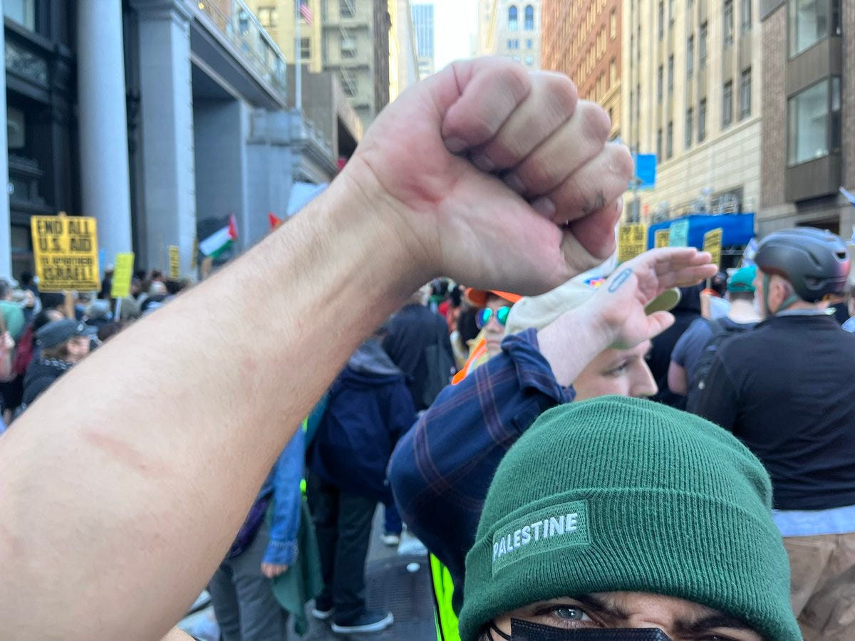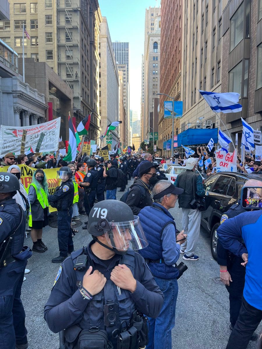 This includes how people feel about Hamas’ recent attack on Israel. If you think their actions are fine or justified, don’t be shy. You will certainly have company. Crowds of supporters came to San Francisco (many seemed to be from out of town) on Sunday, October 8 to celebrate the massacre. So did plenty who opposed it.